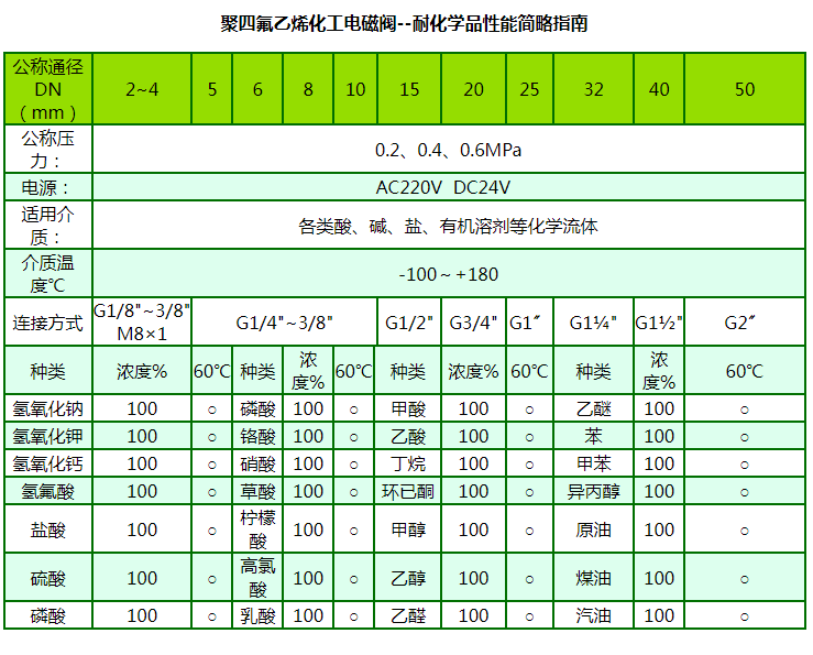 聚四氟乙烯化工電磁閥具有優(yōu)異的耐腐蝕性能,對(duì)所有的常用化學(xué)品都呈惰性。幾乎可以抵抗所有化學(xué)介質(zhì)(包括濃硫酸和王水)。具有優(yōu)異的耐熱性能,應(yīng)用溫度為-100~180℃,材料可長(zhǎng)期在230~260℃下工作。特別適合腐蝕嚴(yán)重、溫度高且化學(xué)品不允許與潤(rùn)滑劑接觸的環(huán)境。