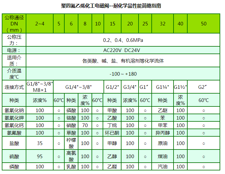 聚四氟乙烯化工電磁閥具有優(yōu)異的耐腐蝕性能,對(duì)所有的常用化學(xué)品都呈惰性。幾乎可以抵抗所有化學(xué)介質(zhì)(包括濃硫酸和王水)。具有優(yōu)異的耐熱性能,應(yīng)用溫度為-100~180℃,材料可長(zhǎng)期在230~260℃下工作。特別適合腐蝕嚴(yán)重、溫度高且化學(xué)品不允許與潤(rùn)滑劑接觸的環(huán)境。