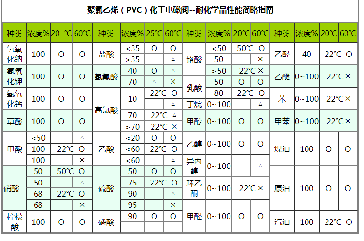 聚氯乙烯(PVC)化工電磁閥具有優(yōu)良的耐腐蝕性能,耐酸(包括稀硝酸)、堿、鹽、氣體、水等的腐蝕。對無極性的烷烴及強(qiáng)極性的羧酸、醇類有較大的抗溶劑能力。少數(shù)氧化性酸在濃度較高時(shí)對其有較大的腐蝕作用。有一定的剛度和強(qiáng)度,適用溫度為-0~60℃。